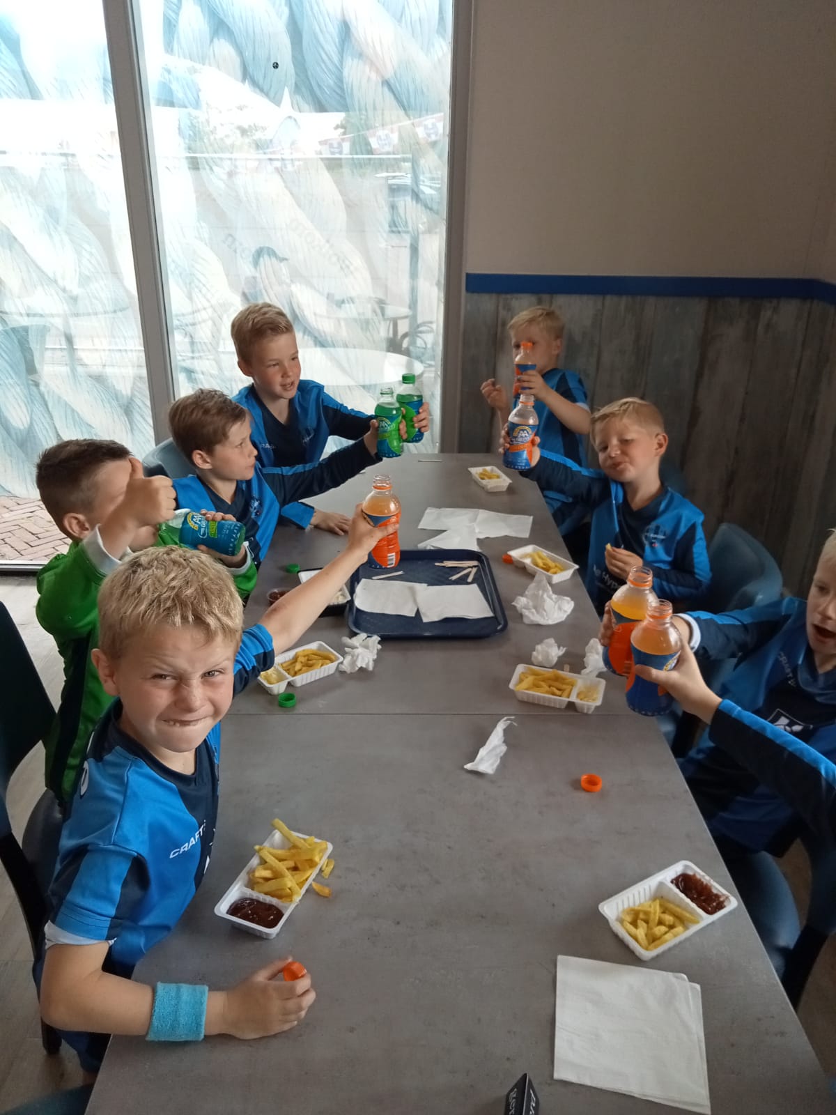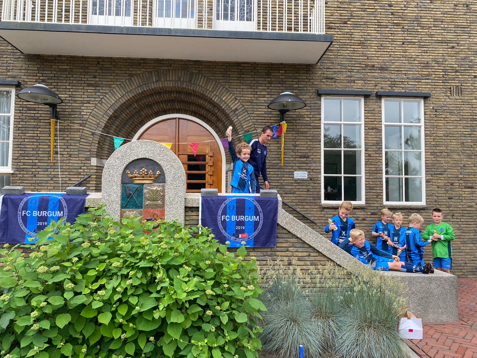 Aangezien kampioenen een waardige huldiging verdienen vond deze plaats bij het Gemeentehuis. De burgemeester was helaas verhinderd maar dat mocht de pret niet drukken. Aanwezig confetti kanonnen, fakkels, slingers, FC Burgum vlaggen en een mini replica van de schaal en uiteraard prachtige kampioensbekers! En dit allemaal onder het toeziend oog van alle ouders, pake's en beppe's en voorbijgangers werden ze 1 voor 1 gehuldigd op het bordes met een prachtige beker. Vervolgens nog een mooie groepsfoto en op naar Earnewald voor het kampioensfeest met patat, AA en een dikke ijsco waar een paard de hik van krijgt. Mede mogelijk gemaakt door de Fiskrinder waarvoor hartelijk bedankt! Daarna werden de kampioenen zoals het echte sterren betaamt door 2 privé chauffeurs weer thuisgebracht!